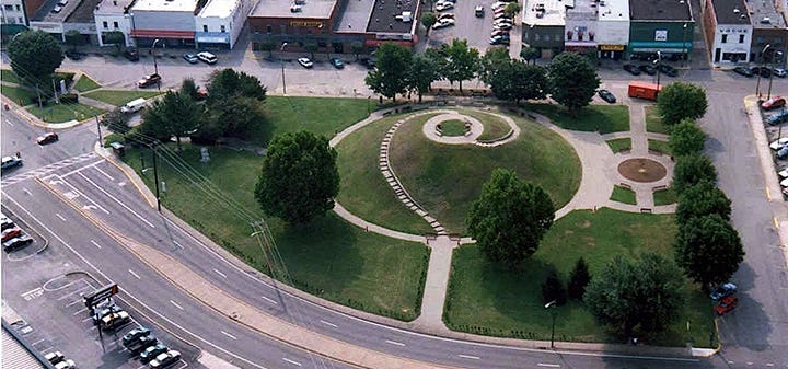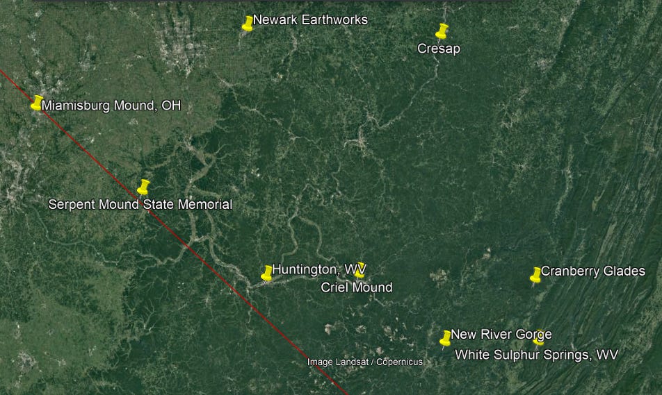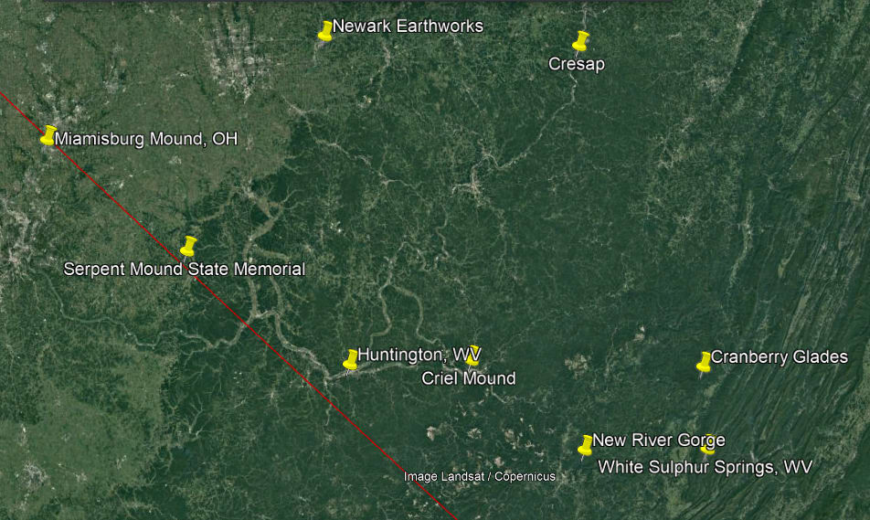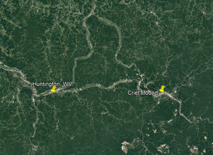 Criel Mound in South Charleston West Virginia, a short distance as the crow flies of of 41-miles, or 66-kilometers, from Huntington.
