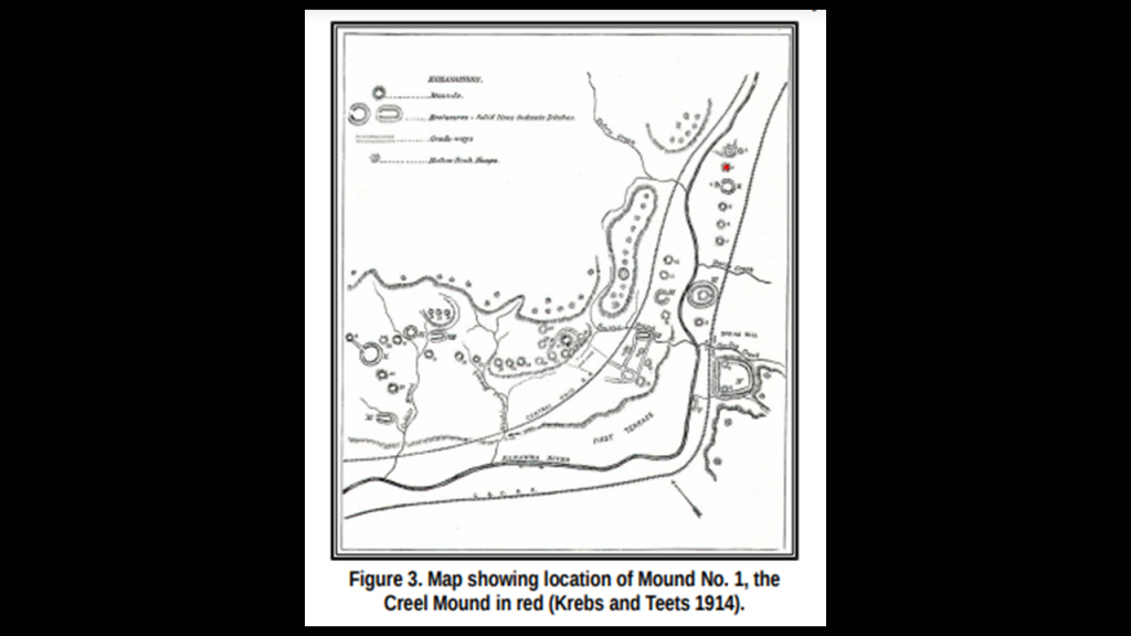 The area extended along the upper terraces of the Kanawha River floodplain for 8-miles, or 13-kilometers, and consisted of 50 mounds and 8 – 10 circular earthworks, as reported by Cyrus Thomas, a prominent ethnologist of the late 19th-century employed by the Smithsonian Institution’s “Bureau of Ethnology,” best known for his work on American mounds.