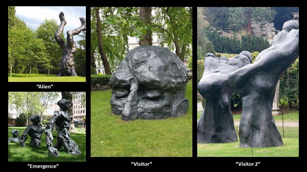 They are putting these sculptures in public places where people can interact with them and accept the as “Art,” without realizing that they might be communicating to us something that has been very well-hidden about the world we are living in.