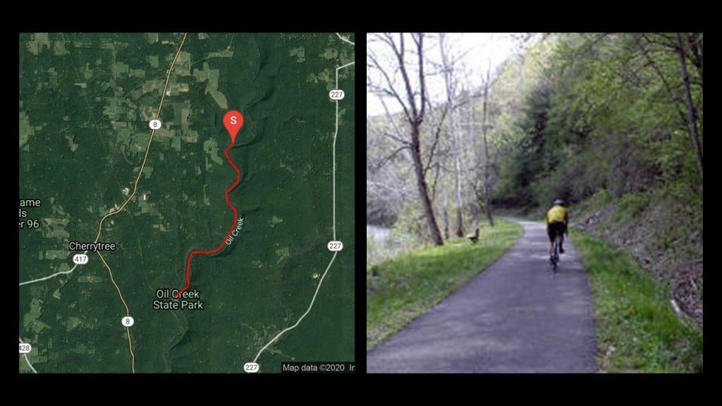 Today,the Oil Creek State Park Trail runs on the bed of the first railroad line to reach Titusville, the Oil Creek Railroad.