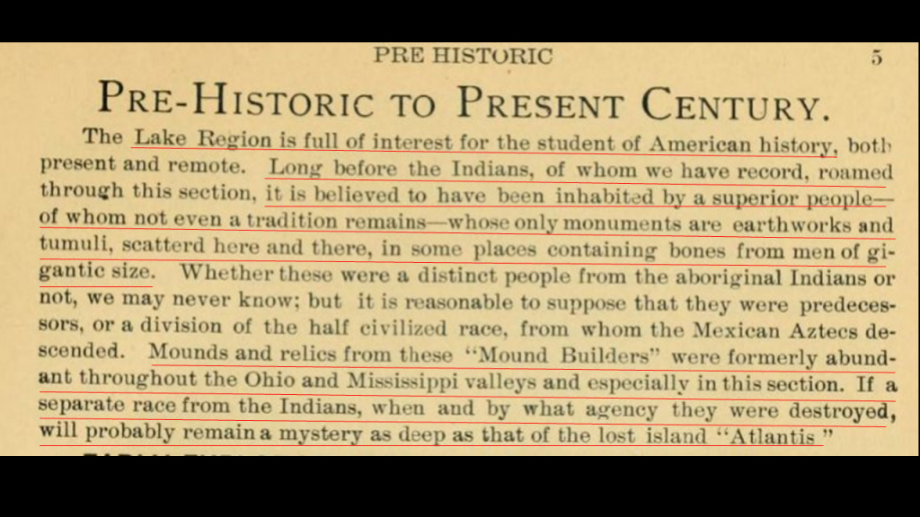 Talking about the Great Lakes Region, it says “Long Before the Indians…it is believed to have been inhabited by a superior people – of whom not even a tradition remans – whose only monuments are earthworks and tumuli, scattered here and there, in some places containing bones from men of gigantic size.”