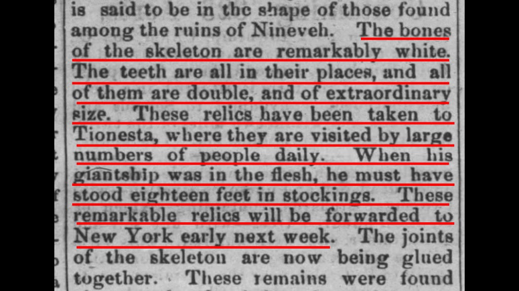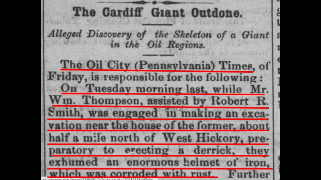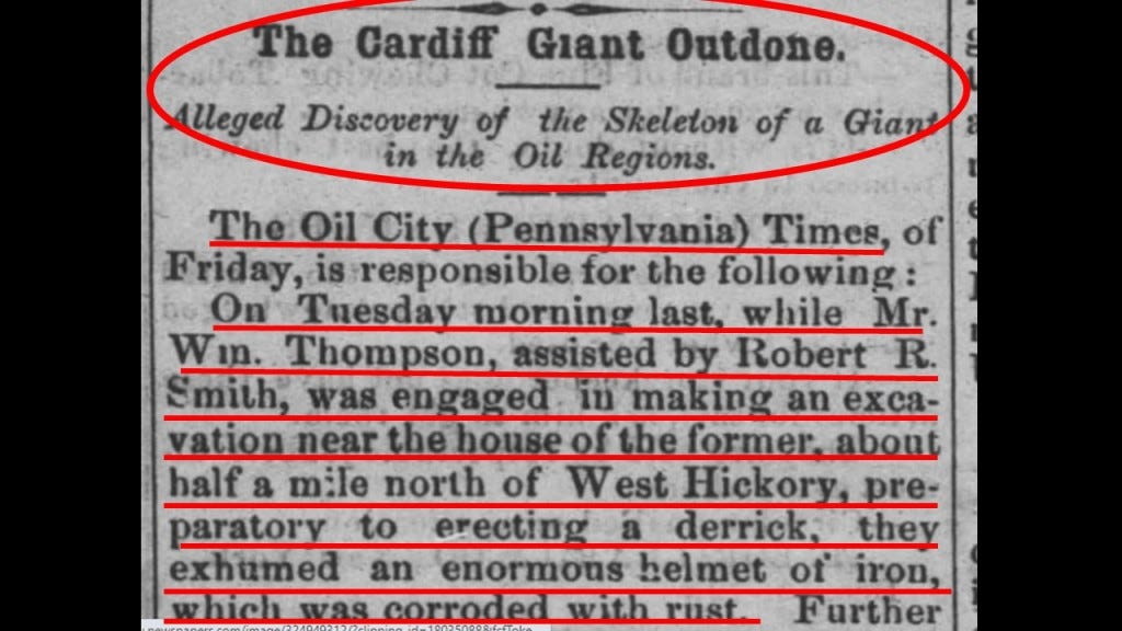At the top of the article, it referenced the “Cardiff Giant Outdone” and the alleged discovery of the skeleton of a giant in the oil regions.