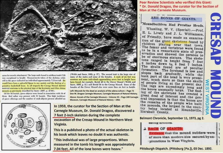 Number 9 on the Top 10 list in North America was documented to have been found in 1959 by Dr. Donald Dragoo, the Curator for the Section of Man at the Carnegie Museum of Pittsburgh, at Cresap Mound in West Virginia at 7-feet, 2-inches, still a little over 2 -meters, – tall.