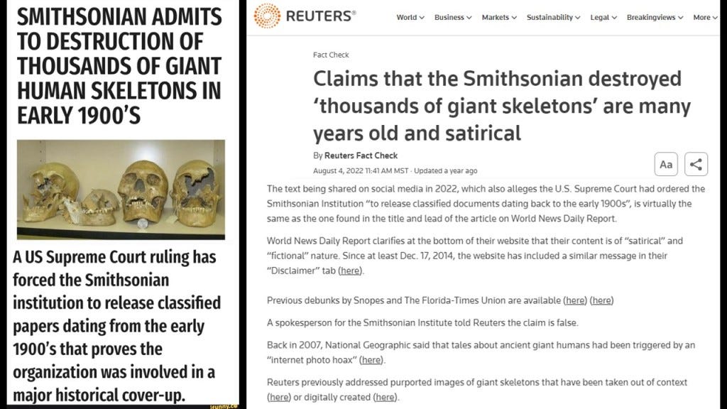 On the one-hand, there are reports that the Smithsonian admitted to the destruction of thousands of giant human skeletons in the early 1900s as the result of a U. S. Supreme Court ruling, and on the other hand, there are fact-checkers vigorously debunking this as a satirical claim and false.