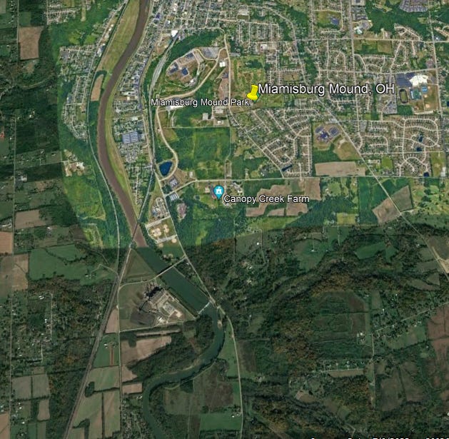 The Miamisburg Mound is located next to the S-shaped Great Miami River.