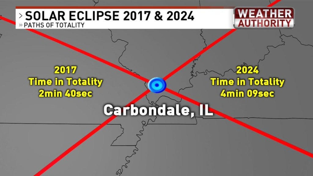 Carbondale was the crossing point of the “Paths of Totality” for both the 2017 & 2024 solar eclipses, locations where the moon’s shadow completely covers the sun, and this part of southern Illinois was and is the “point of greatest eclipse duration,” where the shadow of the moon from the eclipse of the sun lasts the longest.