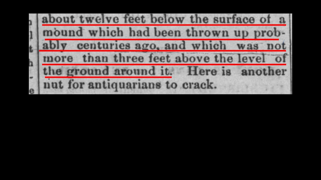 And lastly, the bones were found about 12-feet, or 3.5-meters, below the surface of a mound, and the mound was not more than 3-feet, or less than a meter, above the level of the ground around it, and the article ended with "Here is another nut for antiquarians to crack."