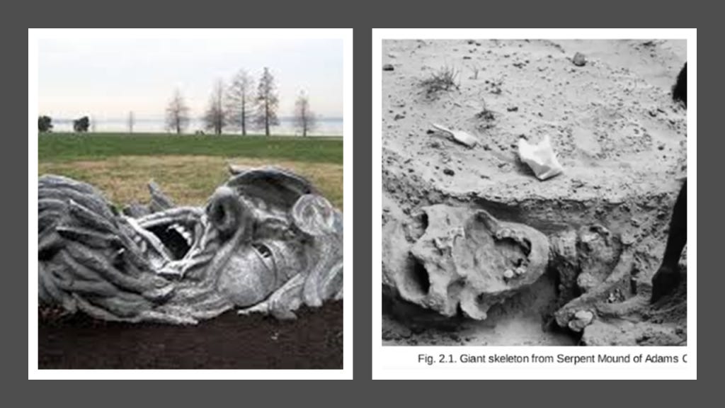 I find it interesting to note that the head of the giant in these “Awakening” Sculptures, with the mouth in mid-scream, on the left, looks very much like the mouth in the head of this giant skeleton that was uncovered in Adam’s County, Ohio, near the Great Serpent Mound, on the right.