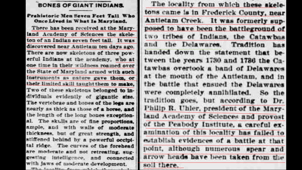 It further goes on to say that the locality from where these skeletons came near Antietam Creek in Frederick County was supposed to have been the battleground of two tribes of Indians, the Catawabas and the Delawares.