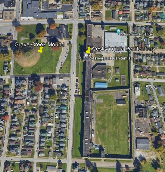 The Grave Creek Mound just so happens to be smack dab across the street from the West Virginia Penitentiary!